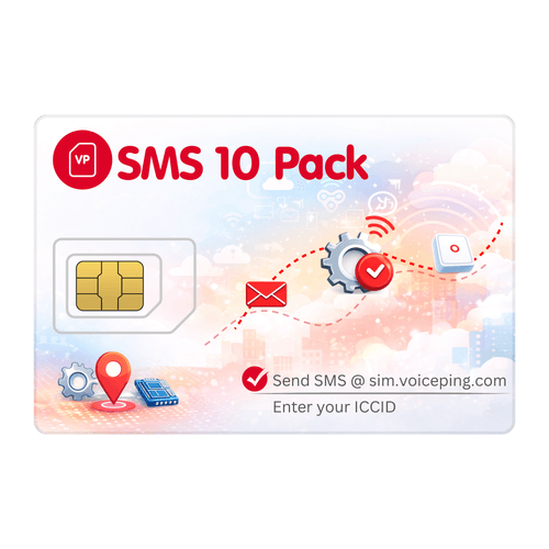The SMS 10 Pack enables SMS-based configuration commands on VoicePing data SIMs using ICCID-based activation. Designed for GPS trackers and IoT devices, it allows remote setup and control without a phone number. SMS is for device configuration only, not personal texting.